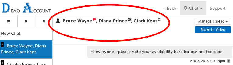 1. Participant names are listed at the top of the chat. Each one will have an icon indicating their notification type: