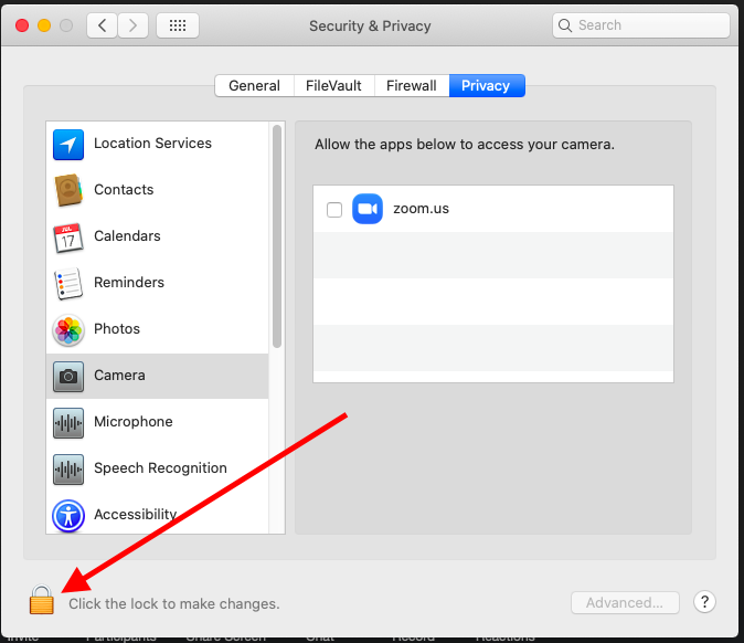 5. Once the preferences are unlocked, click on the checkbox next to "zoom.us", and then the lock symbol to save changes. You will now be able to use your camera n your next session.